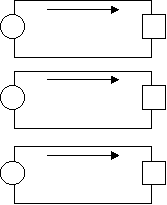 まずまったく等しい三つの負荷に電力を供給する三つの回路を考えます(左図)。○が電源で□が負荷,→が電流の流れる方向です。